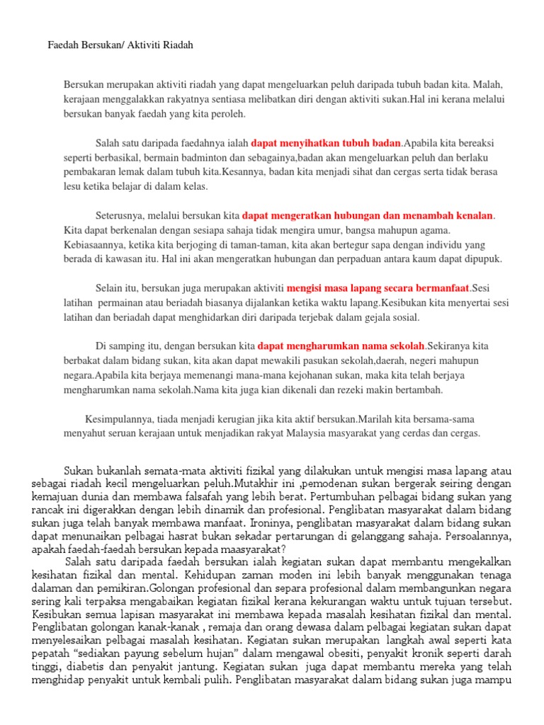 Karangan - Faedah-Faedah Bersenam. Sebagai contoh aktiviti bersukan yang merupakan antara aktiviti harian setiap ahli masyarakat.