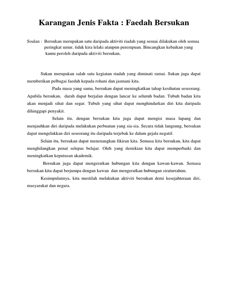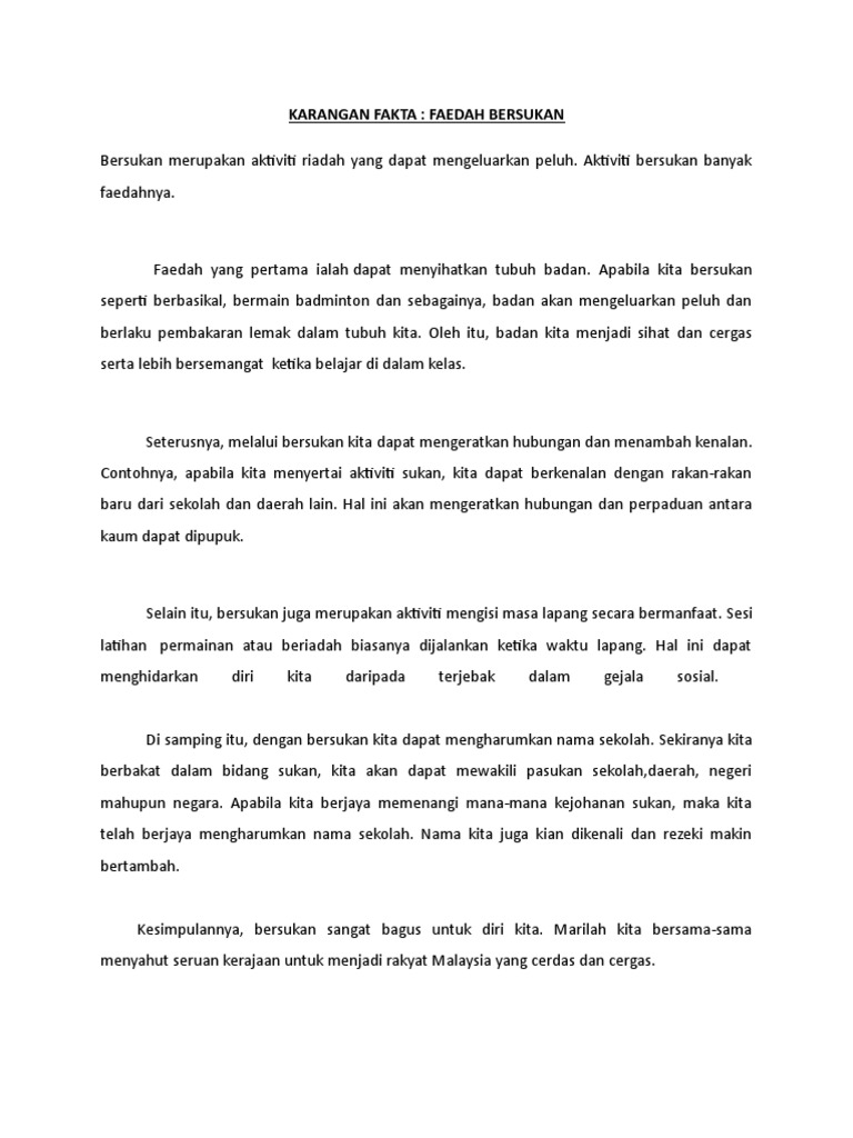 Kita boleh bersukan di mana-mana sahaja sama ada di rumah ataupun di sekolah. Contoh Karangan Bahasa Malaysia. Tulis karangan tentang kebaikan bersukan dalam kalangan pelajar.